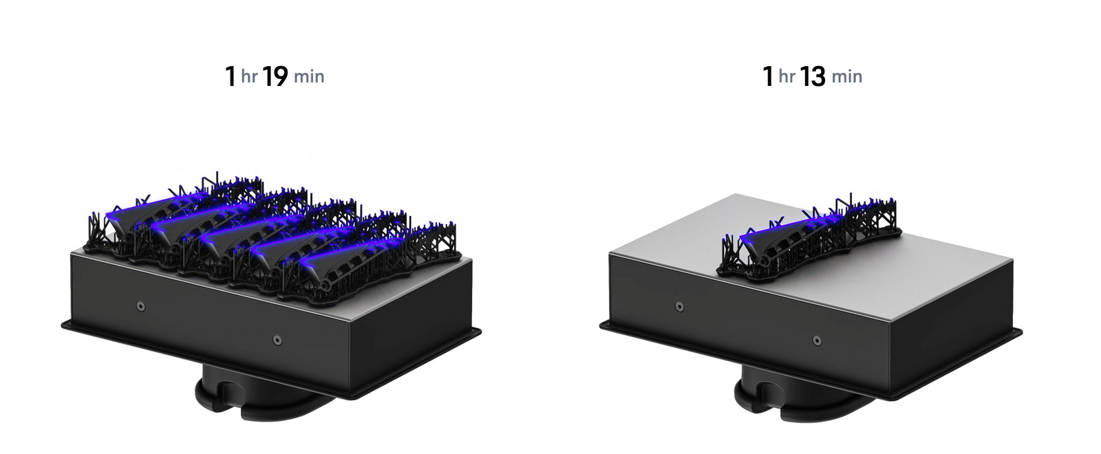 Form 4 sin hastighet drives av LFD-teknologi, en kraftig kombinasjon av ultra-høyeffekt LED, kollimeringslinser, optiske filtre og en robust LCD. Sammen herder de hvert lag av resin raskt - uavhengig av delstørrelse eller antall.